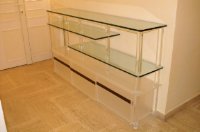 Nous privilégions une découpe traditionnelle qui n' altère pas la qualité et la durée de vie du Plexiglas ,ainsi qu' un polissage manuel qui confère au plexiglas un rendu poli brillant parfait des chants. (aussi transparent que la face sans aspérités ni striures ,à l oeil et au toucher ) contrairement au laser ,technique usité ,dans le marché des présentoirs et meubles bas de gamme , qui privilégie le gain de temps et de production (une seule étape au lieu de 5 ) aux détriments de la qualité,de la finition et de la durée de vie du produit car seul la rentabilité prime .